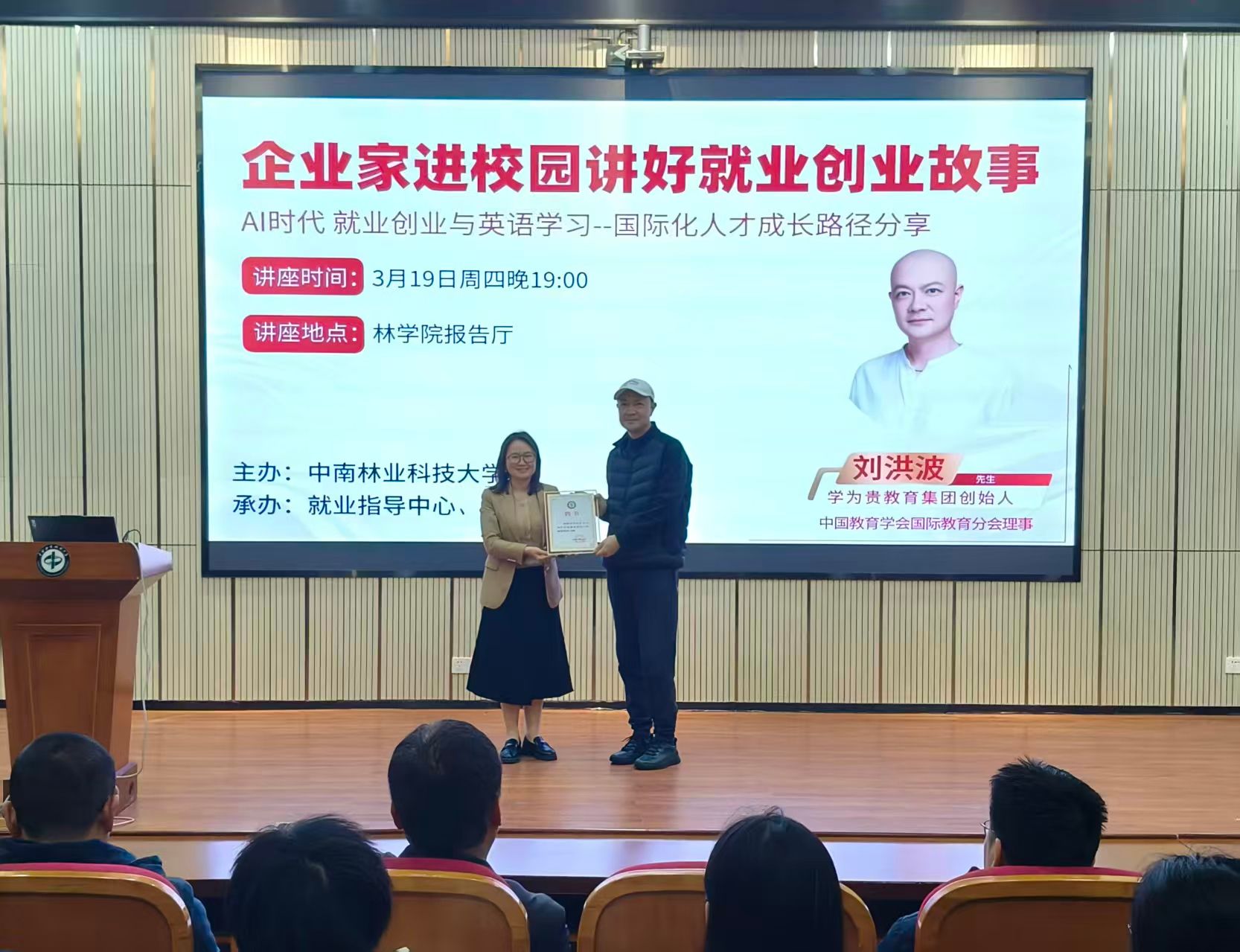 活动现场,创新创业学院副院长樊毅为企业家刘洪波先生颁发聘书,聘请其为学校创新创业学院导师。分享环节中,刘洪波结合就业与创业实践,聚焦AI时代分享就业创业见解。他解读AI生态五层理论,指出2026年是AI应用爆发元年,AI会催生新岗位而非取代就业;他着重强调,AI时代情商是核心竞争力,共情与理解用户真实需求的能力,是人工智能无法替代的关键。
