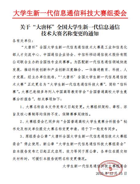 2026年第十三届大学生新一代信息通信科技大赛(原“大唐杯”全国大学生新一代信息通信技术大赛)将于2026年8月举行。为培养学生的创新实践能力及运用新一代信息通信技术解决实际问题的能力,学校决定组织学生参加此项竞赛。现将参赛有关事项通知如下: