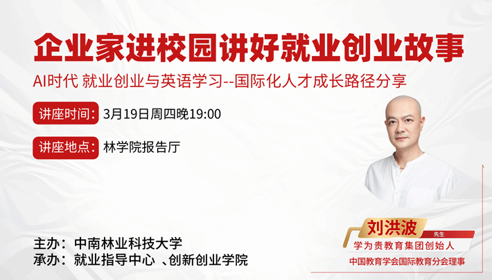 为解答这些困惑,助力同学们在新时代找准自己的成长路径,校就业处特邀 中国教育学会国际教育分会理事、学为贵教育集团创始人——刘洪波老师 走进校园,做客“企业家进校园 讲好就业创业故事”系列活动,为我们带来一场精彩讲座。