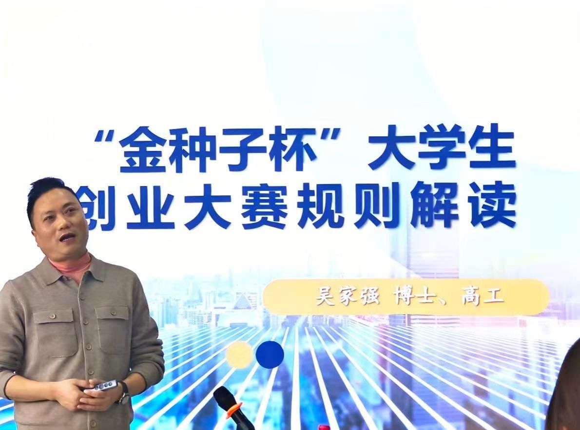 10 月 23 日下午,我校创新创业学院举办 “金种子杯” 大学生创业大赛赛前指导讲座,特邀具有丰富赛事评审经验的高级工程师吴家强博士主讲。路演室内座无虚席,为学生备战湖南省高规格赛事送上 “金钥匙”。